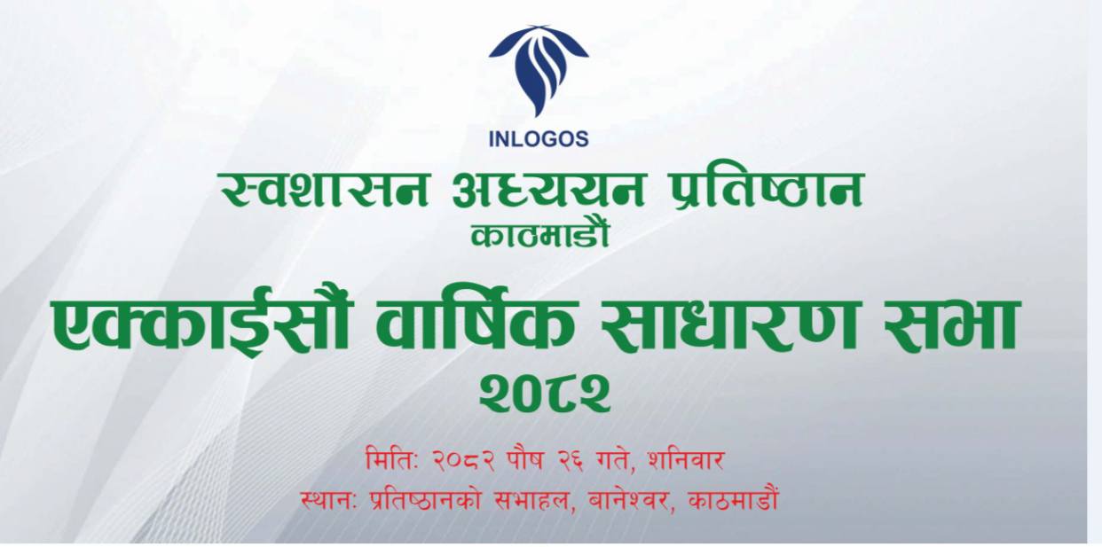 स्वशासन अध्ययन प्रतिष्ठानको २१ औं बार्षिक साधारण सभा मिति २०८२ साल पौष २६ गते, शनिबार, प्रतिष्ठानको कार्यालय, बानेश्वर, काठमाडौंमा सम्पन्न भएको छ । प्रतिष्ठानका कार्यकारी अध्यक्ष श्री महेश प्रसाद दहालको अध्यक्षतामा सम्पन्न यस साधारण सभाले प्रतिष्ठानको गत आ.व. २०८१/८२ को प्रगति विवरण र चालु आ.व. २०८२/८३ को नीति तथा कार्यक्रम सहितको कार्यकारी अध्यक्षको प्रतिवेदन र आ.व. २०८१/८२ को आम्दानी खर्च, लेखा परिक्षण प्रतिवेदन र चालु आ.व.२०८२/८३ को प्रस्तावित बजेट सहितको कोषाध्यक्षको आर्थिक प्रतिवेदन सर्वसम्मत रुपमा स्वीकृत गर्ने निर्णय गरेको छ ।